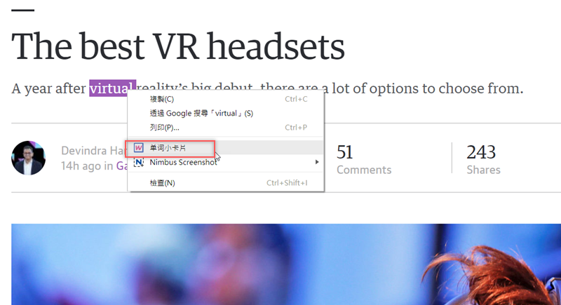 接著在你閱讀文章的時候,滑鼠反白選取單字按右鍵「單詞小卡片」。