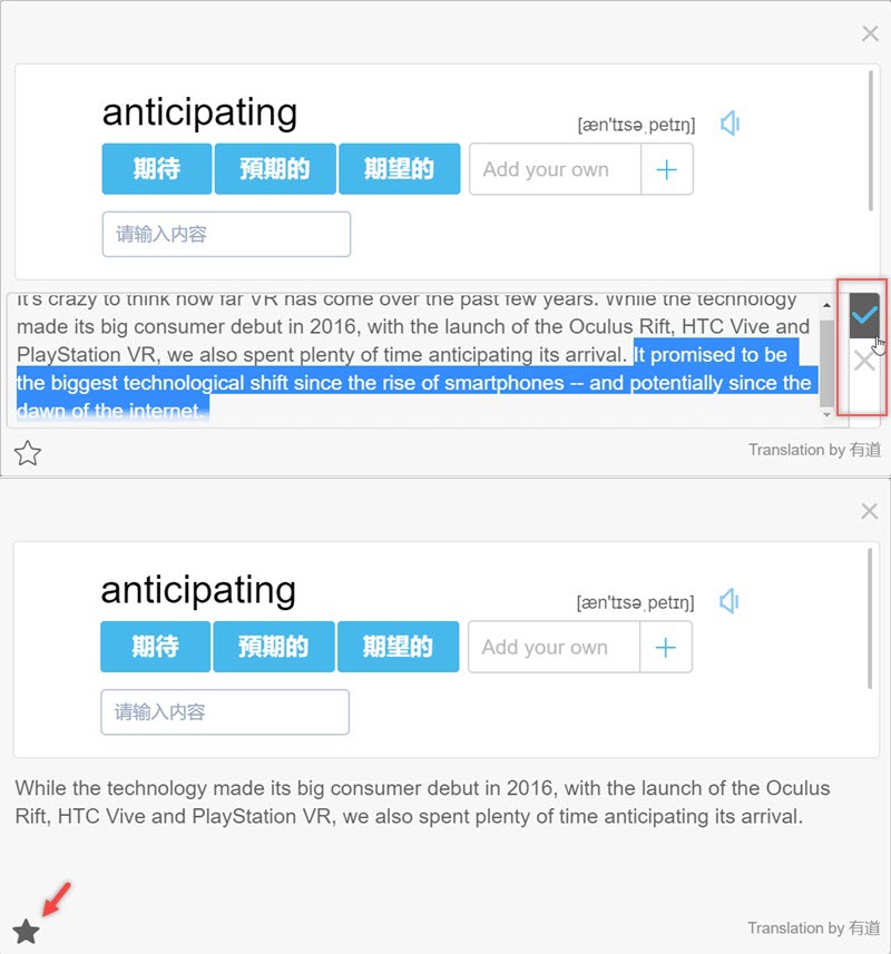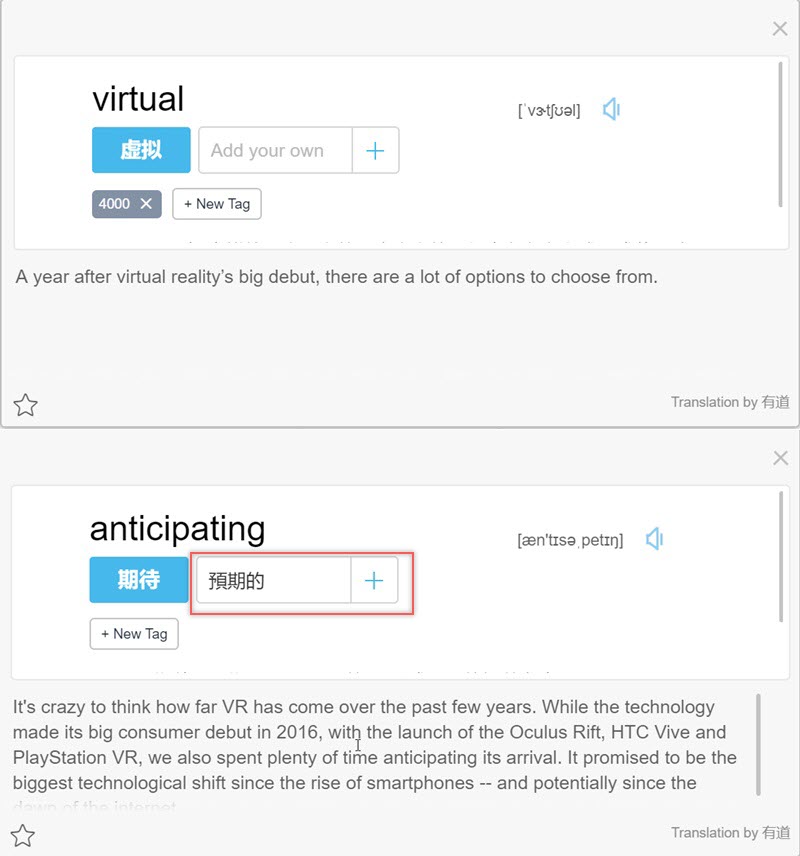 就會幫你翻譯並發音,可自行加入字義及標籤,底下的例句則是從文章中單字的前後文截取的。
