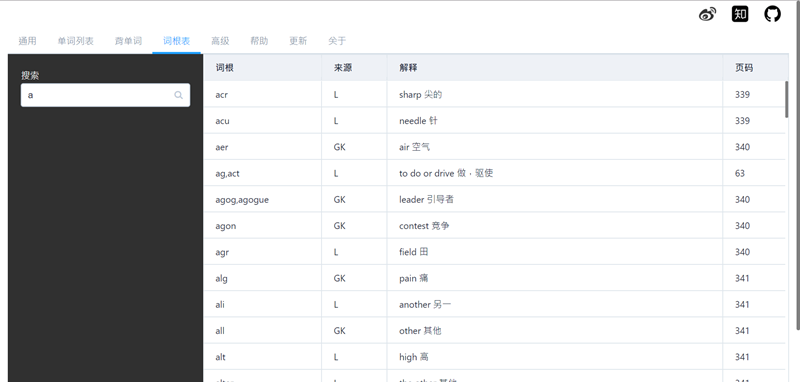 還附上好用的詞根表,可輸入字母搜索,蠻方便的。