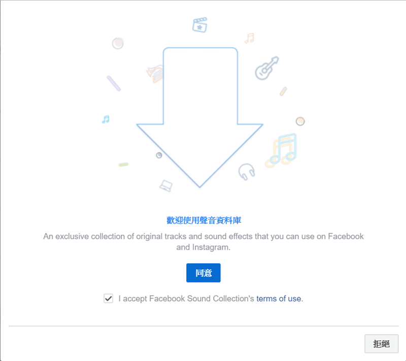 連到網站後,會先要求同意使用規則,這些檔案可供用戶在 FB 跟 IG 免費使用,如果用在其他地方可能會有版權問題。