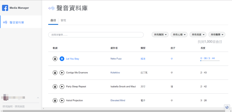 Jamendo Music 等,現在臉書也推出聲音資料庫,目前收集了 1000 首曲目、1504 個音效,曲目部分包含 24 種風格、21 種心情,還分為合奏、有無人聲、男聲或女聲,而音效也有各種環境音和生活中常會出現的聲音,相當實用,一起來看看。