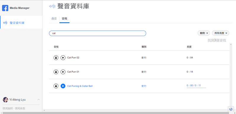 也能輸入關鍵字搜尋,基本上應該只有英文會有結果,像輸入「cat」就有三項,點開來聽都是貓咪的呼嚕聲,貓奴們應該很有感。