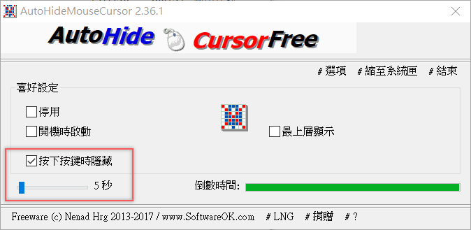 使用面板很簡單,可勾選按下按鍵時隱藏(就是滑鼠點一下隱藏游標),或是移動滑桿來調整秒數,例如放置不動五秒就隱藏,綠色那條倒數時間是告訴你剩多少秒游標會消失。