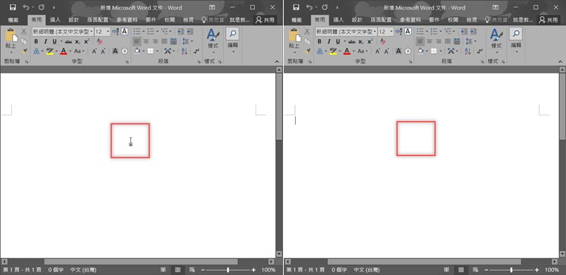 用 Word 檔示範,左邊還看得到游標,右邊是過了設定的靜止秒數後,游標自動隱藏,畫面就是空白的了,要再次移動滑鼠才會跑出來。