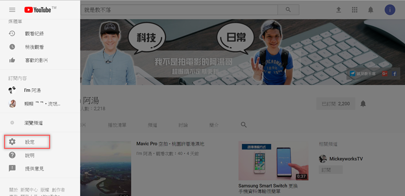 這些留言都有一個共同點,無論前面是什麼文字後面一定會加連結,阿湯建議不管你知不知名、有沒有個人頻道,只要會發影片就要設定,免得你的觀眾中毒,先到左邊的設定區。