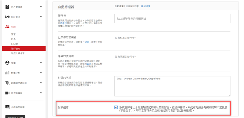 社群→社群設定,看到封鎖連結這項,將它勾選起來。