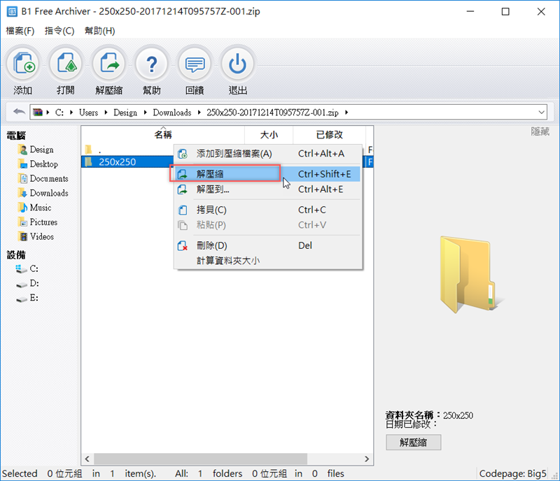 先來解壓縮,從左欄顯示的資料夾位置找到要處理的檔案,點右鍵解壓縮即可,同時也能刪除、複製協助整理你的電腦。