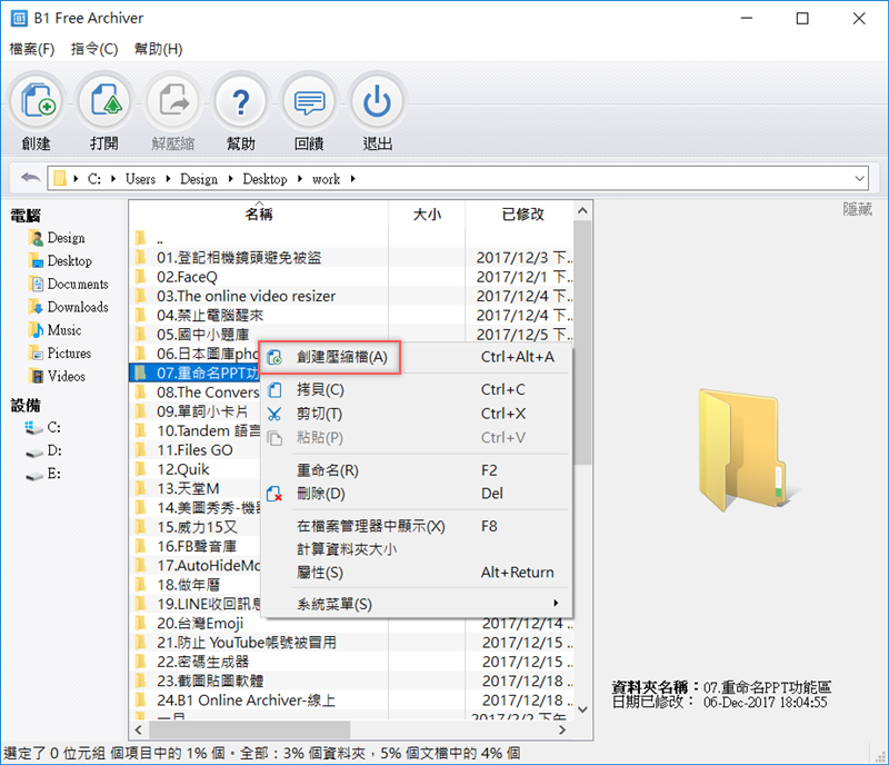 建立壓縮檔也是一樣,找到資料夾按右鍵選擇動作。