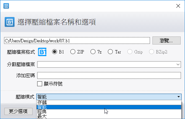 檔案格式可選擇 B1、ZIP、7z、Tar 等,再看要不要分割或添加密碼,預設的壓縮模式為智能,可試需求改成存儲、經典、最大。