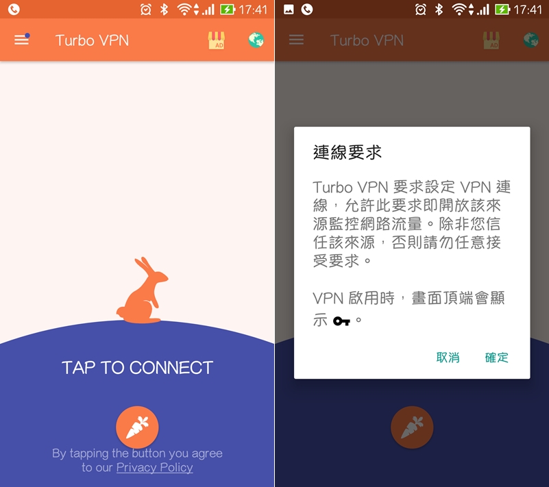這類型的 APP 使用方式都差不多,開啟後點下面那根紅蘿蔔連線,APP 性質的關係會監控你的網路流量,同意就按下確定。