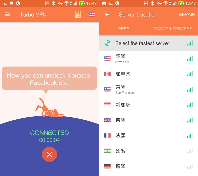 開始連線會計時,結束再點「X」即可,點開右上角國旗可看到目前連線的國家與網速,包括美國紐約、加拿大、美國洛杉磯、新加坡、英國、法國、印度、德國、荷蘭共九個,預設是以最快的伺服器為準,也能視需求更改。