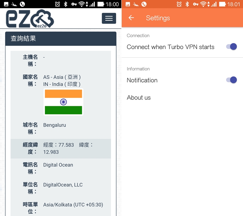 阿湯改選印度,連到 IP 網站確認的確在印度沒錯,主機名稱也不會顯示保證隱私,因為沒有流量問題所以可設定開啟 APP 自動連線,速度會更快,用用看吧。