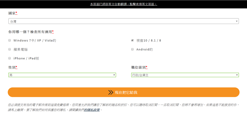 填上 Email、國家、系統版本、性別、職位級別的資料,再點底下橘色那條「現在把它給我」。