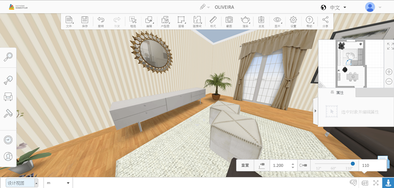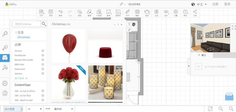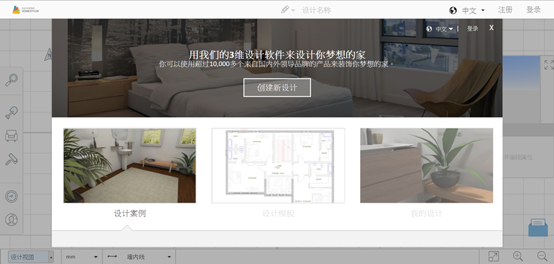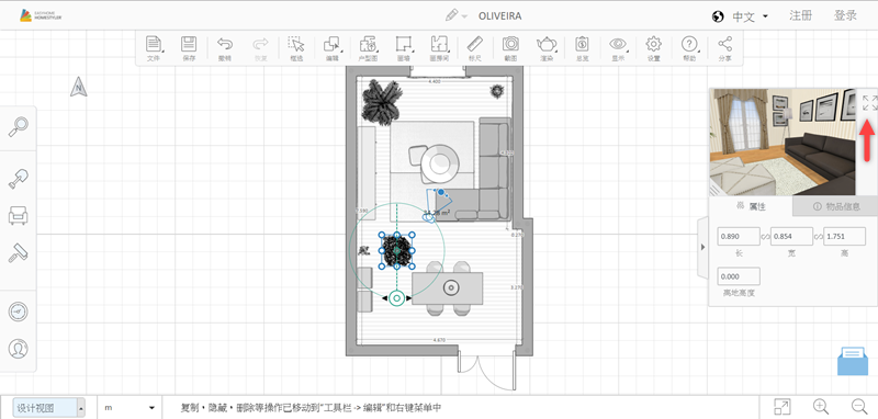 作為一個沒有任何基礎的普通人,當然是從現有案例入手比較快,進入後中間編輯區是以平面圖顯示,上排是框選、畫房間或牆面、標尺等工具,左排是各種建築及家具樣式目錄,右邊有一個三維預覽視窗。