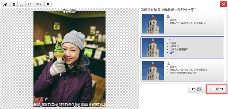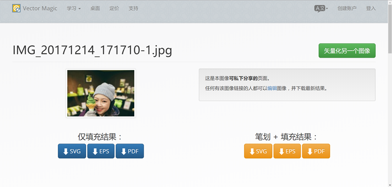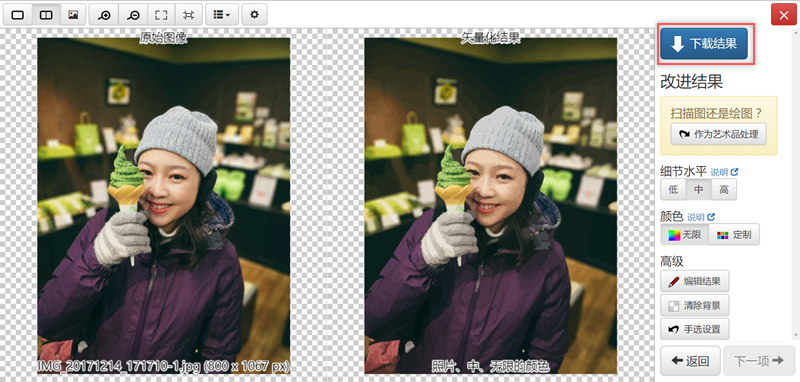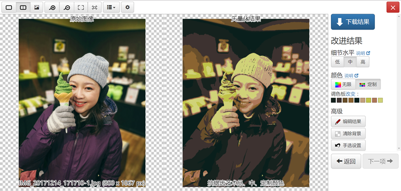 大概花個十幾秒分析與處理,完成後會顯示原始圖像跟向量化的結果,這張雖然原始的解析度有 800*1067px,但用來轉換後顯然不夠大,從臉上有點油畫的感覺就知道,點右下角「手選設置」調整。