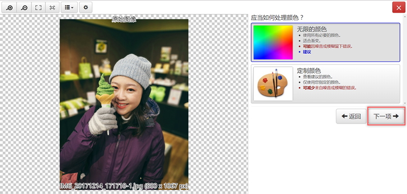 顏色方面預設是所有顏色都會用上,也可以選訂製顏色來減少模糊的機率,如果不需要就繼續下一步。