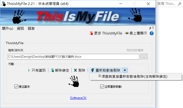 點開重新啟動後刪除這項還能設定不須查詢,速度更快。