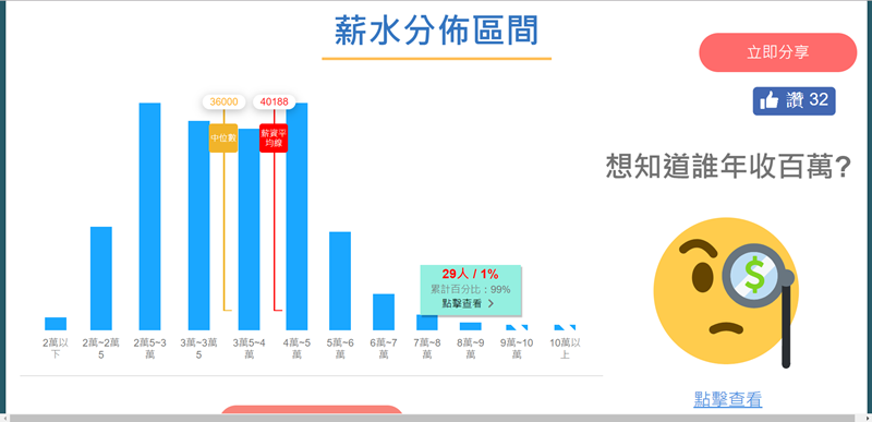 薪水分布區間以 4 萬到 5 萬最多,略高於 2 萬 5 到 3 萬,也可繼續查看年收百萬的行業是哪些,會連到阿湯介紹過的「