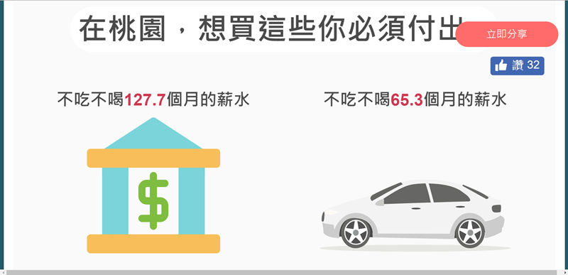 這邊就是新聞常常會拿來比喻的,必須不吃不喝多少年才能買房子或其它,30 坪的房子平均要 127.7 個月的薪水,實在有點慘啊。