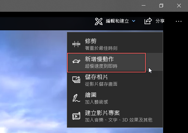 從內容找到要處理的影片,點開右上角清單找到「新增慢動作」。