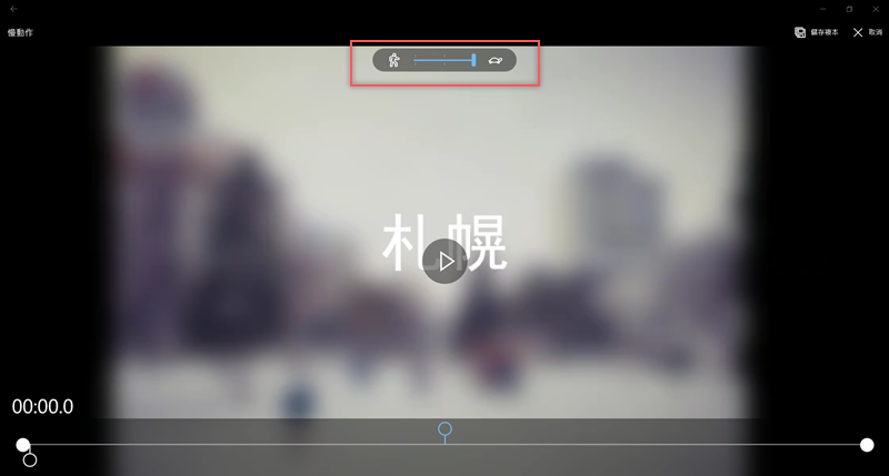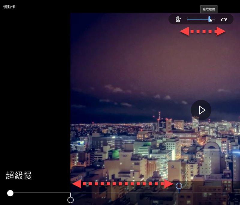 播放影片找到慢動作的區段,調整底下兩個圓圈來設定開始與結束點,再到上方圖示條拉速度,左下角也會一併顯示調整的程度。
