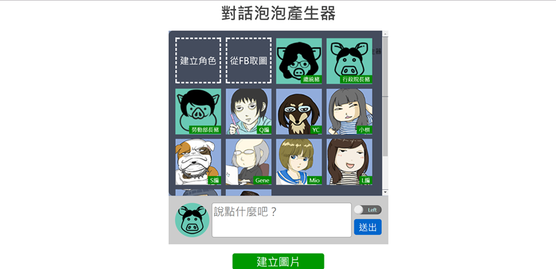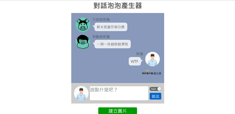 選好頭像後在底下輸入文字,切換對話方向即可建立圖片,阿湯以時事製作了一張圖