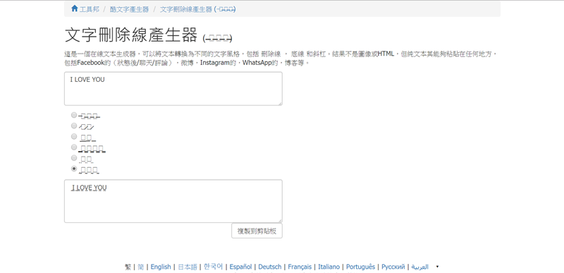雖然現在 Word 等軟體都可在文字上加刪除線,但這款還提供六種不同樣式可選擇,跟前一款一樣輸入完後直接複製上面的文字即可,阿湯先用中文字結果變空白框,似乎不支援,如果有人用成功了再跟阿湯說哦。