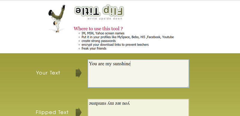 將輸入內容顛倒後可用在密碼、個資等需要防護的地方,拿去鬧朋友也行,直接選取複製即可,如果內容是中文會將句子反過來,例如「最近好嗎」變「嗎好近最」。