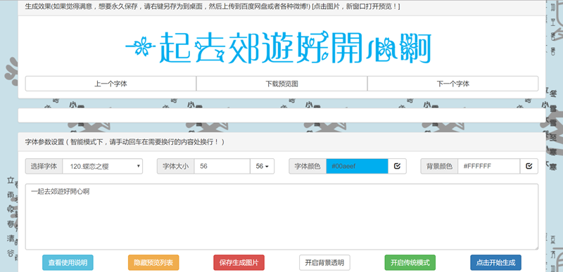 專文介紹過的這個綜合性的線上工具,數百種毛筆字、藝術字、花朵、數字、名人字體任你挑選,文字及背景的顏色也能隨意調整,內容相當豐富可以一個個套用玩玩看。