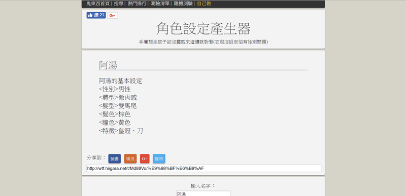 這個網站也是整合了不少測驗及產生器,像這款角色設定產生器似乎是用在創建動漫角色?原來阿湯是雙馬尾的男性啊。