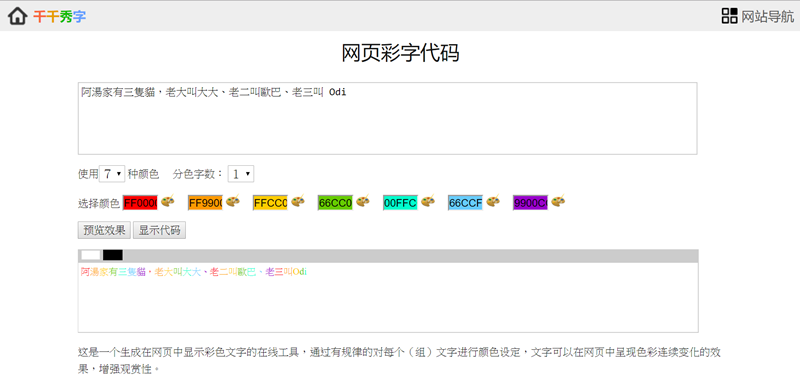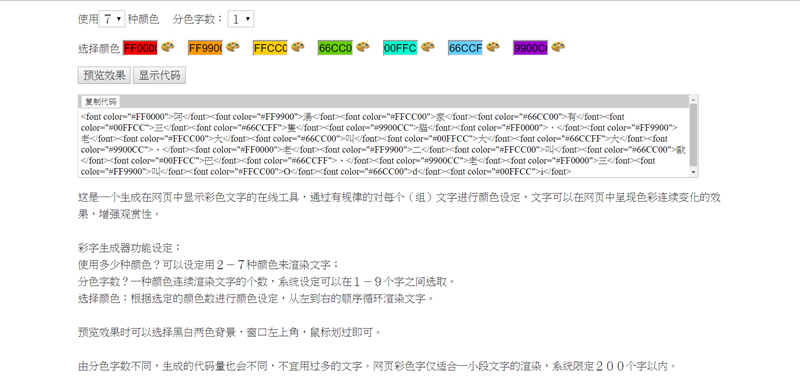 生出來的是網頁顯示專用的文字,可複製代碼到你的網頁方便編輯,不用對照色碼自己慢慢打。