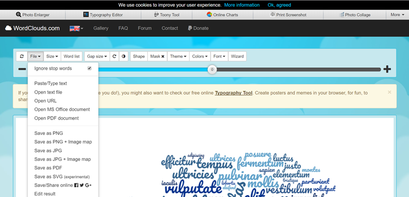 最後來看這個文字雲產生器,可將網頁內容文字轉換拼湊成一張圖片,或是手動輸入、使用 PDF 文件或其他檔案來匯入。