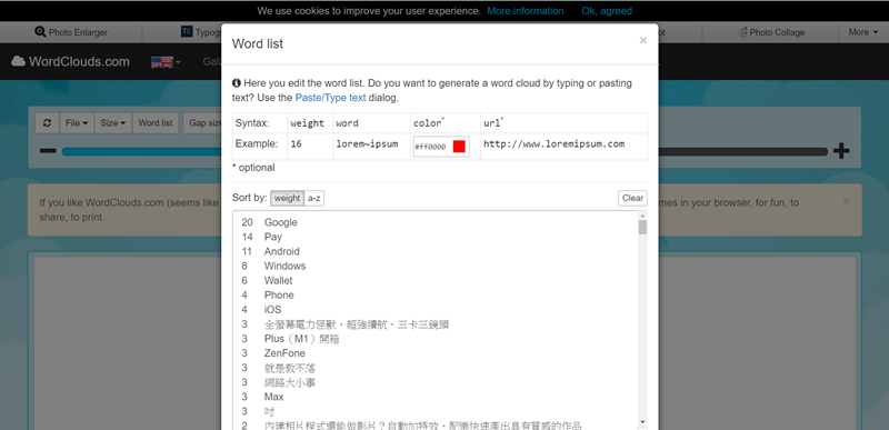 匯入後可點「Word list」查看清單,並更改文字內容、比重、顏色等不同的顯現方式。