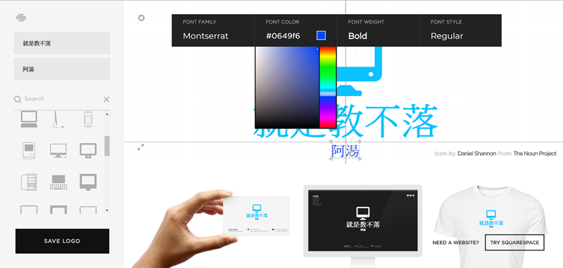 試試看內容用英文,字體調整的自由度果然高很多,可一一套用到喜歡的,對了底下都會有範例,可預覽商標在名片、電腦桌面、T 恤的樣子。