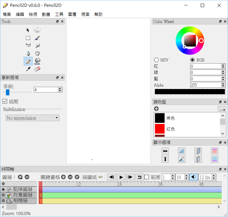 解壓縮後開啟,面板清楚簡單,左邊是繪圖工具,右邊主要是調色盤等選色工具,重點在下方,熟悉的時間軸分點陣圖層、向量圖層及相機層,用來放中間空白處編輯的圖像。