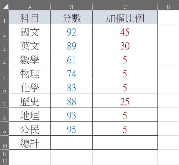 阿湯做了一個成績表當範例,包含原始分數與加權比例,大家仔細看會發現加權的所有數字加起來超過 100,一般來說很少遇到這種情況,是阿湯故意設計的,表示就算複雜一點也能算出。