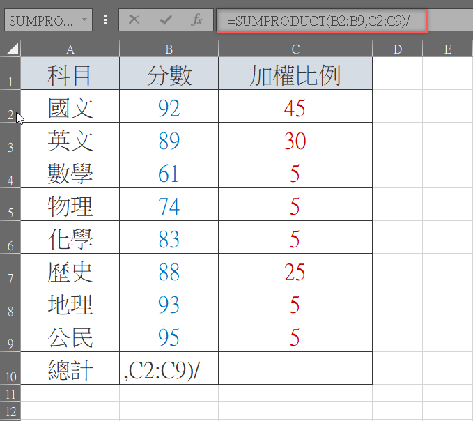 第二個是加權比例,範圍是「C2:C9」,手動輸入或用滑鼠拖曳選取都 OK。