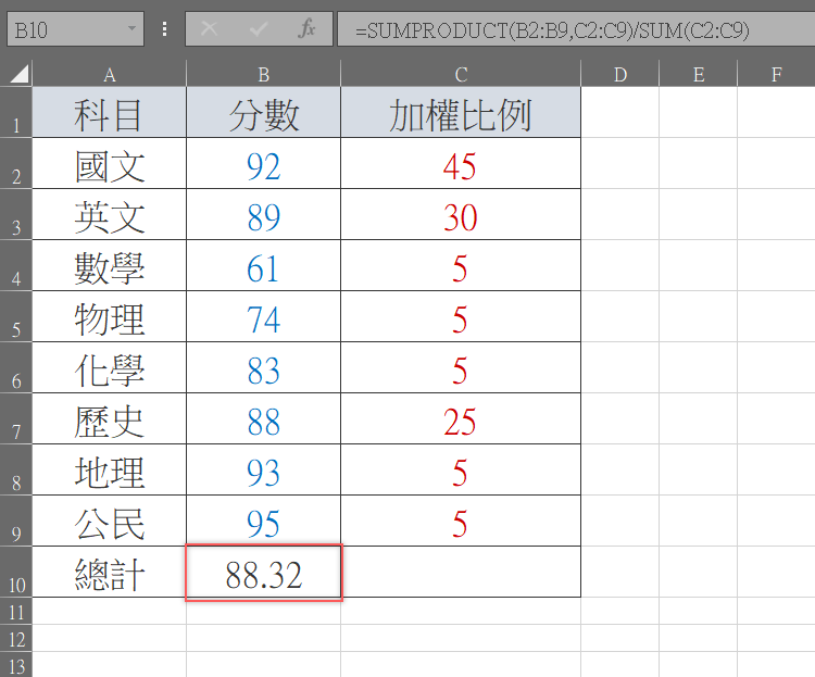 重點來了,如果按下確定,出現的值將是所有科目分數加權後的總合,以這個例子來看就是(B2 * C2)+(B3 * C3)+(B4 * C4)+(B5 * C5)+(B6 * C6)+(B7 * C7)+(B8 * C8)+(B9 * C9),而我們要算的是平均,必須將這個總和再除以原始分數才是答案,先在公式後面輸入「/」。