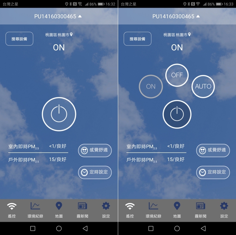 在 APP 中的操作可以選擇開/關/自動模式,APP 的首頁也會即時顯示目前的室內/戶外 PM2.5 數據,平常要出門也可以看一下,如果真的空汙嚴重還是戴個口罩再出門吧。