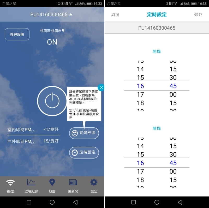 AUTO 模式下,會依照你認為感覺舒適的當下進行記錄,之後切換成 AUTO 模式後,就會將此定為標準,只要超出標準就會運作,如果是上班族使用的話,也可以定時自己的上下班時間,這樣就不需要自己手動操作,一上班就是好空氣。不過 APP 應該下次更新可以加入「星期」的設定,這樣放在公司的話,六日就能不開啟,完全依照上班週期設定了。