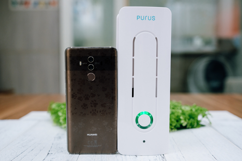 PURUS air 既然是桌上型,畫面上看起來好像很大?其實放個手機在旁邊比較就可以看出來,其實體積真的蠻小的,阿湯展示的手機為 HUAWEI Mate 10 Pro,PURUS air 總高度為 21 公分而已哦。