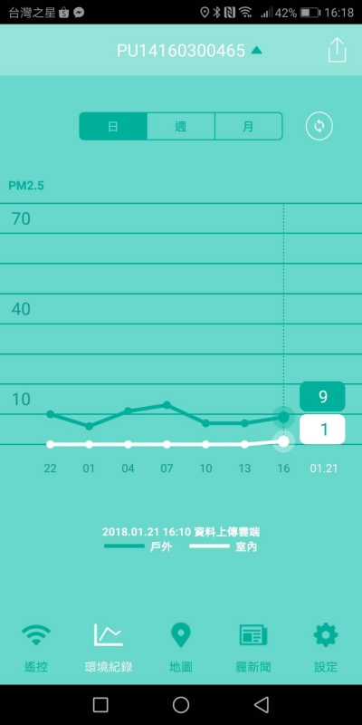 在 APP 裡可以查看目前的環境記錄,可以查看日/週/月的週期,阿湯家在 15 樓空氣真是不錯,不過因為我自己是算嚴重的過敏兒,只要些微的空汙就會立即反應在我的鼻子上了......所以平常家中 PM2.5 差不多也都會維持在 10 以下。