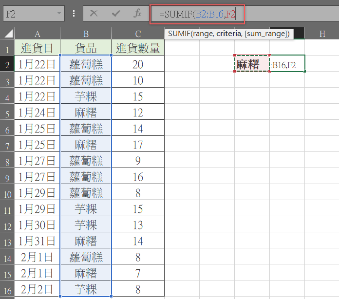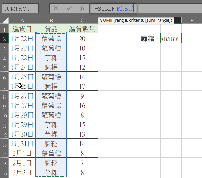前面阿湯說的可能有點抽象,來看表格範例應該就懂了,以這份表格來說,不同天數、不同品項都分別有貨品進量,假設我們只要知道「麻糬」在這些天的進貨數量,先在空白列輸入「=SUMIF(」。