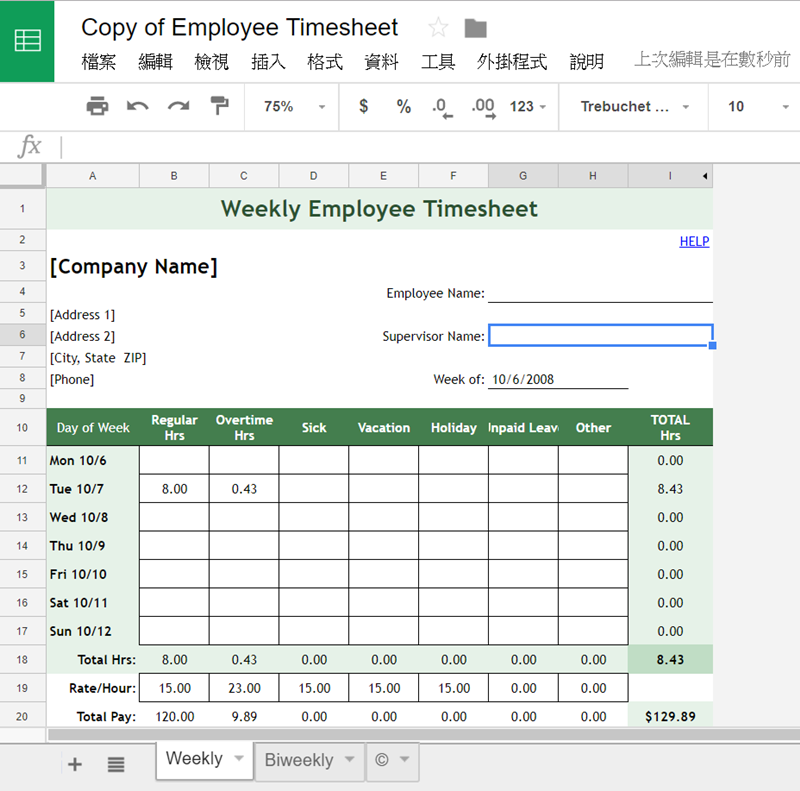 這份薪資相關的表格就相當詳細,不只版面清楚美觀,需要的項目及公式也都幫你設計好,只要更改內容即可使用,要說缺點就是如果不習慣英文介面、看不懂,可能就不好操作。