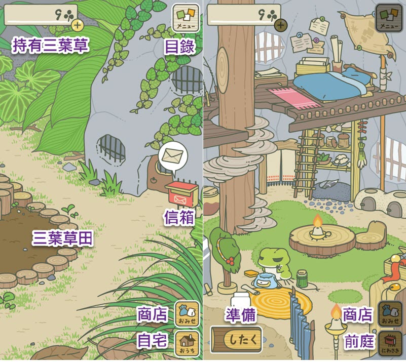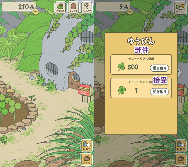 信箱有時候會有通知,一開始遊戲都會送你一些三葉草,點接受即可,之後可能會出現看廣告得獎品、旅行中蛙蛙寄的明信片,訪客的回禮等。