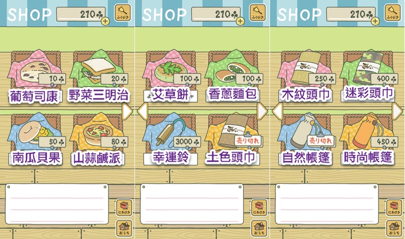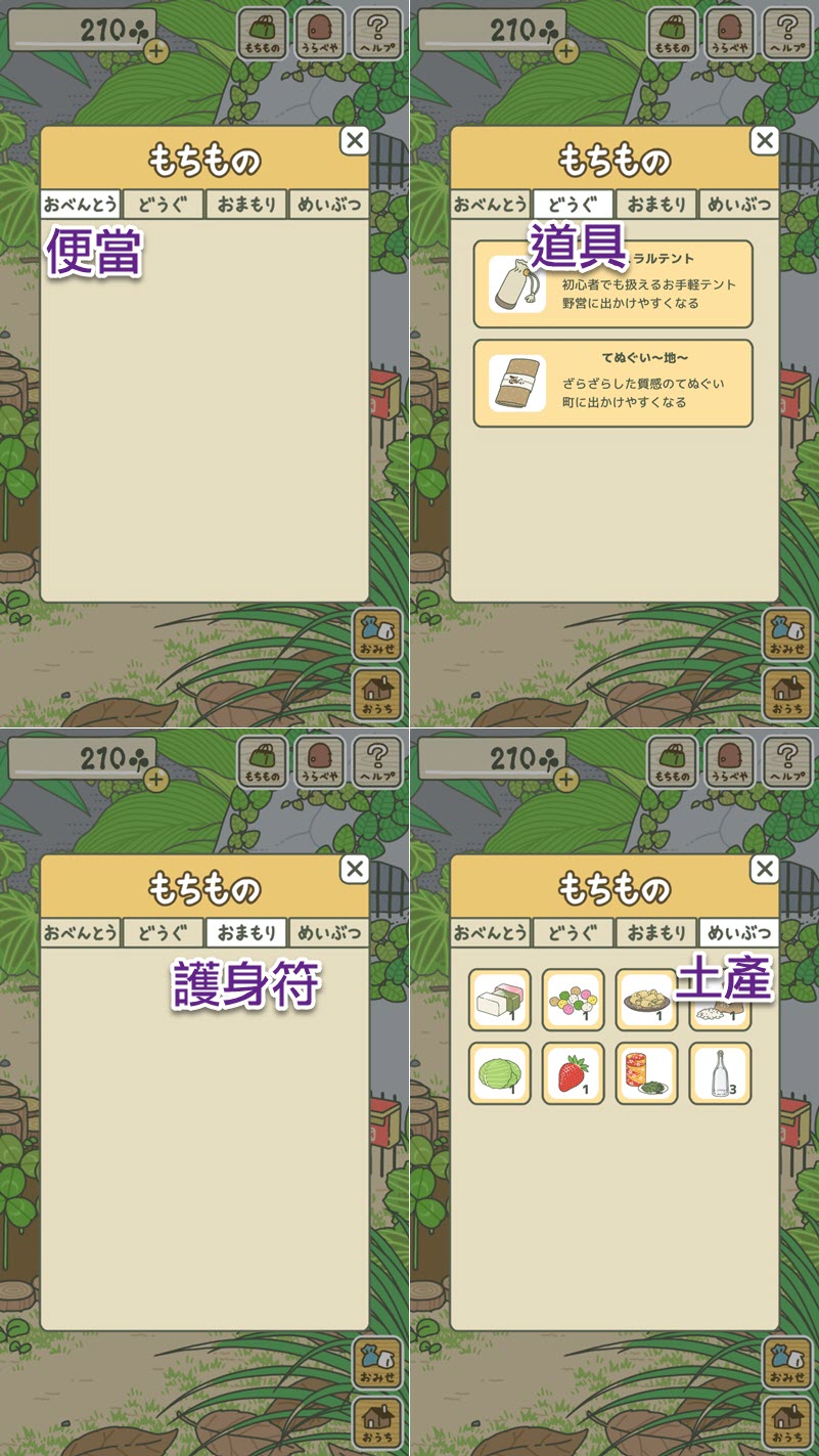 點右上角查看目錄中的現有物品,包括便當、道具、護身符及土產,便當就是食物,屬於一次性的物品所以要常常補充,道具是永久性的,護身符分商店買得到的幸運鈴(永久)和有機會種出的幸運草(一次性),土產也是一次性的。