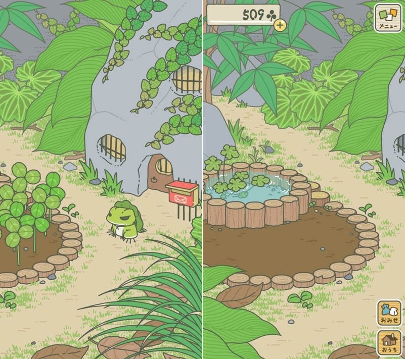 瞬間長滿!而且阿湯剛離開遊戲前先給青蛙準備了一些行李,所以牠也出門回來囉,完全不用等待。