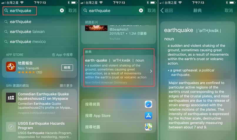 來試試看,輸入英文後會先顯示 APP STROE 及網站的相關內容,往下滑才會看到辭典,點進去後阿湯發現只有來自 New Oxford American Dictiocary 的英英翻譯,沒有中文解釋,是不是少了什麼設定?