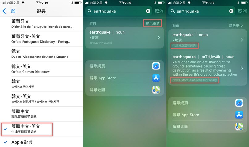 回到辭典往下看,才確定要下載「簡體中文 - 英文」這項才能啟動來自牛津英漢漢英辭典的內容,並加上原本就設定到的美式英文,記得要點「顯示更多」才會出現其他項目,可惜目前沒有繁體中文版,希望之後會加入。