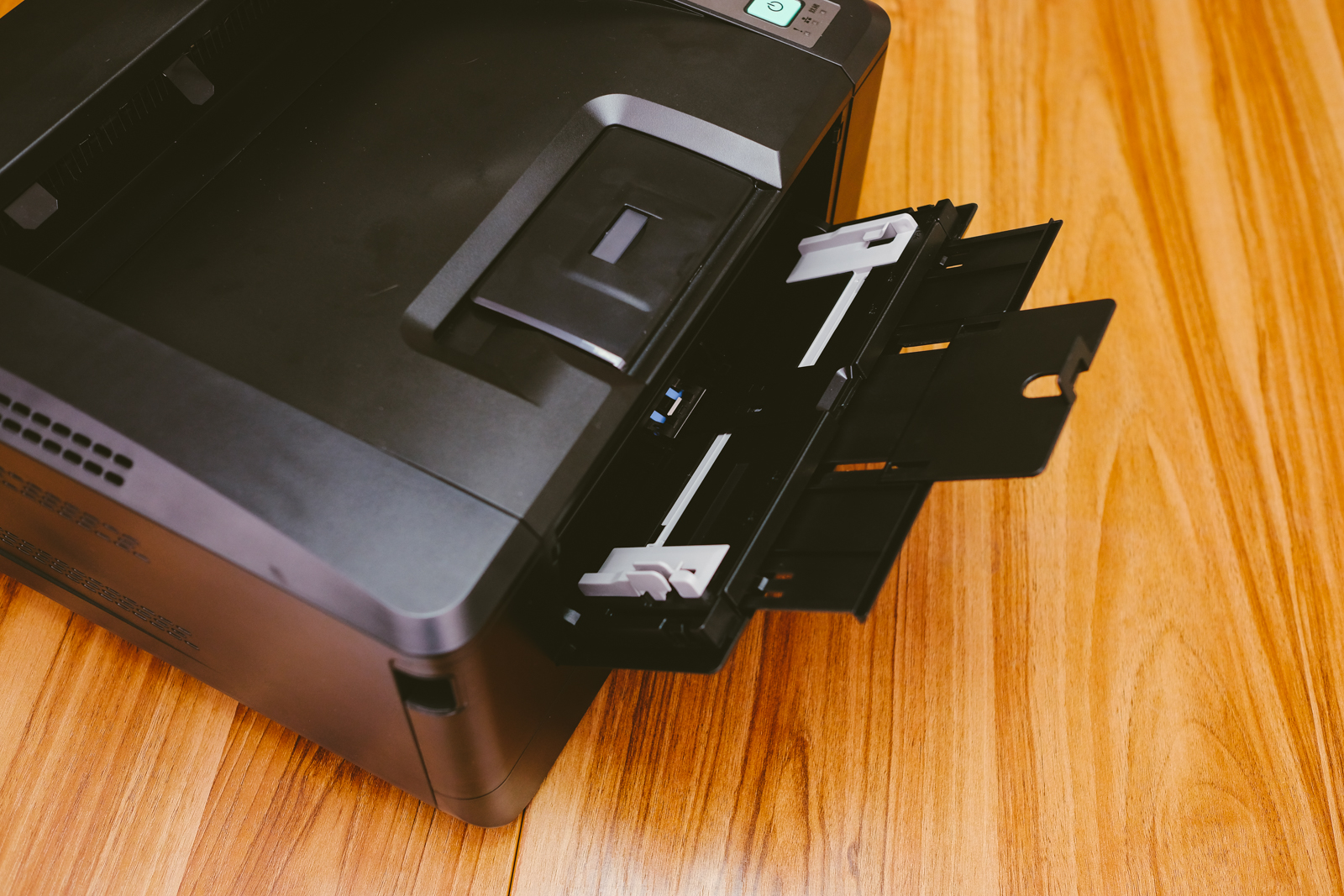 有時列印一些不重要的東西時應該都會使用印過的紙張、或背面空白的廢紙等,這時不需要打開送紙匣來放入要列印用的紙張,前方就有手動送紙匣,將要用來列印的紙張放在這裡就可以了,另外像是要印的紙張若是比較厚的也建議可以透過手動送紙匣,因為這邊是直通式進紙可避免壓折的問題。